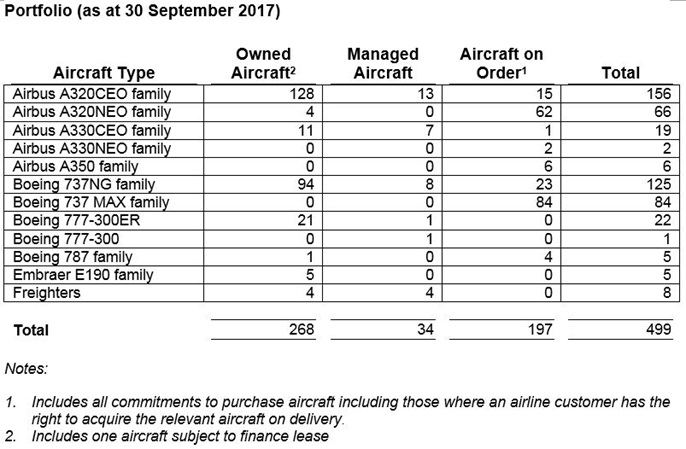 - 100% of the 78 aircraft scheduled for delivery in 2017, and more than 90% of the 48 aircraft scheduled for delivery in 2018, have been committed for lease