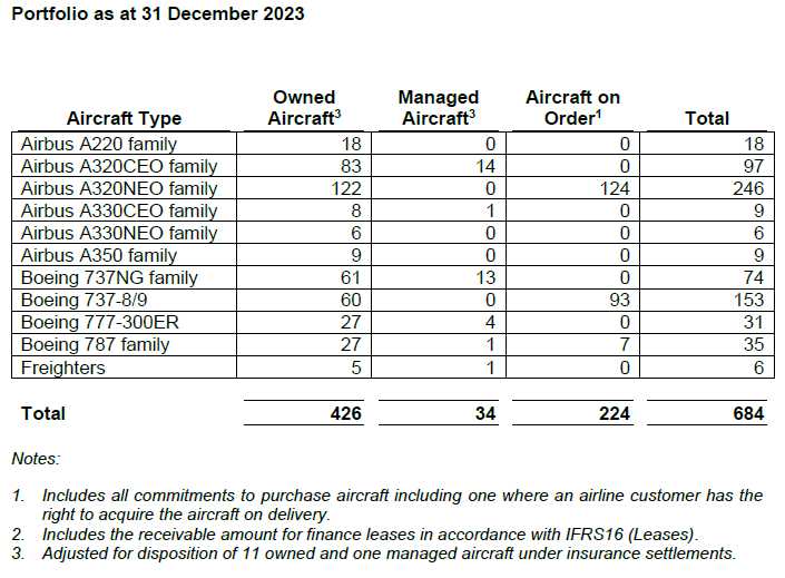 Steven Townend, Managing Director and Chief Executive Officer, said, “In 2023 we celebrated our 30th anniversary. It was a year of record operational performance where we executed our largest ever number of transactions that included 142 lease commitments, the most in any year since our inception. We committed to purchase 95 aircraft, providing the foundation for future balance sheet growth, and we took delivery of 65 aircraft - the most since 2017. Collections exceeded 100% for a second year running and our aircraft utilisation rate improved to 99% from 96% in 2022, both reflecting the strength of the aviation industry. Looking ahead, with a strong aircraft portfolio and orderbook, we are confident in meeting our airline customers’ needs and maintaining our position as a top five global aircraft operating lessor.”