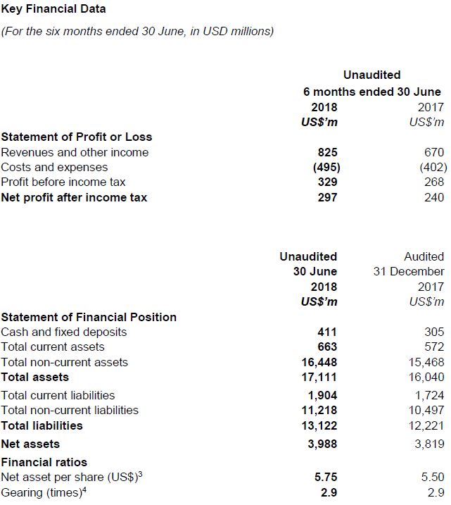 - Maintained strong liquidity with US$411 million in total cash and fixed deposits, and US$3.5 billion in undrawn committed credit facilities as at 30 June 2018